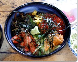11:00頃に富良野を後にし、占冠、日高を経て門別へと出る。最初に来た海沿いをひたすら逆に走る。鵡川、苫小牧、そして室蘭。室蘭の港まで来たときは15:00になっていた。すぐにフェリー埠頭へは行かず、いったん港を通り過ぎ、突き当たり白鳥大橋の直前で左折、道の駅『みたら室蘭』まで来た。少し早いが夕飯のためだ。道の駅の隣には屋台村があるが、そのまた向こう隣に地味な食堂がある。『噴火湾』という名前はすごい店だ。ここで食事。写真の海鮮丼Aは1800円。道内最後のぜいたくだ。 室蘭MAP |