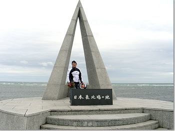 | ずっと見ているといろんな人が写真を撮っていく。このチャリダーの学生、この気温で裸かよ!(笑) 間宮林蔵もじっと見つめる最北端です。 |